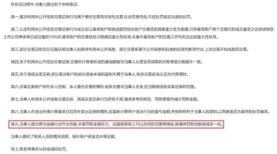 辩称“曾为金融行业作出贡献”,请求将罚款倍数调减至一倍值得一提的是,上述罚单披露,在听证过程中,当事人提出,其“曾为金融行业作出贡献,本案罚款金额巨大、远超其客观上可以负担的范围等理由,恳请将罚款倍数调减至一倍”“当事人利用未公开信息交易证券、违规买卖证券行为恶性不高,请求参考同类型、同背景案件减少罚款金额”等申辩意见,请求从轻或减轻处罚。