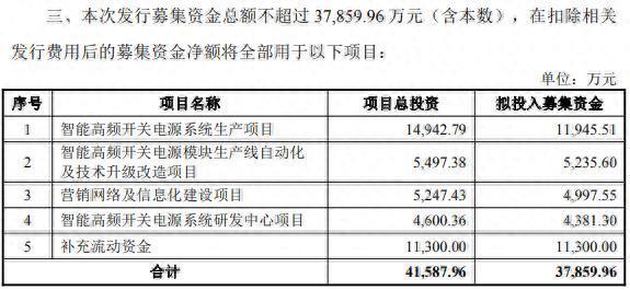 本次发行募集资金总额不超过3.79亿元,扣除相关发行费用后的募集资金净额将全部用于智能高频开关电源系统生产项目、智能高频开关电源模块生产线自动化及技术升级改造项目、营销网络及信息化建设项目、智能高频开关电源系统研发中心项目、补充流动资金。